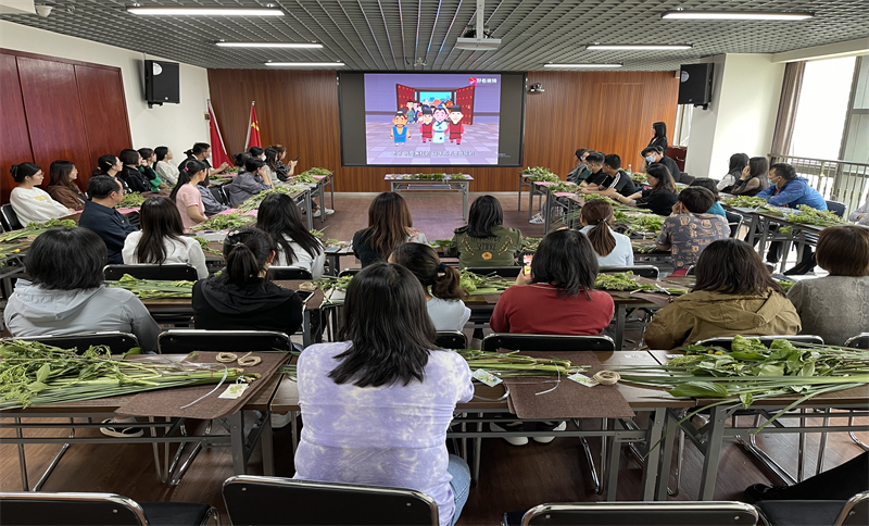 由工会会员代表现场教学,参与人员自己动手制作菖蒲艾草祈福花束。现场一片热闹祥和的气氛。