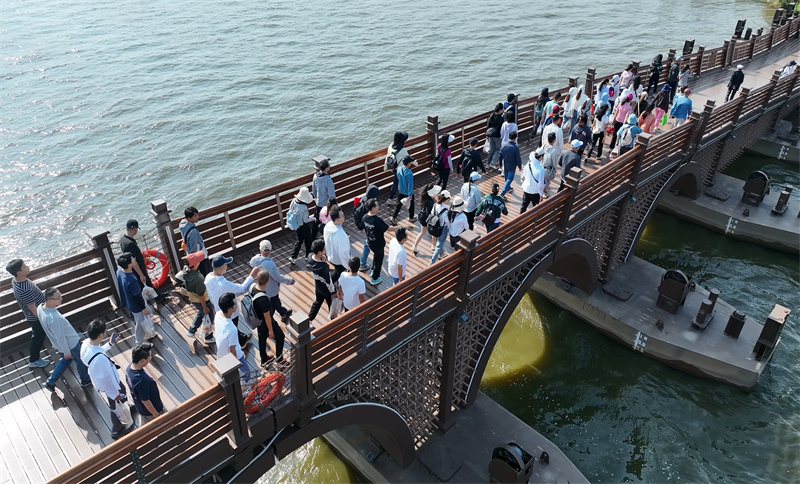 健步走过程中,大家或结伴而行、或谈笑竞逐、或独自慢跑,一路上全体人员昂首阔步、精神抖擞,领略了七孔浮桥、翠堤、芦堤和草堤的美景,身临其境地感受到了“西眺美人、苹天苇地、翠羽丹霞、三春杨柳”的轻松惬意。