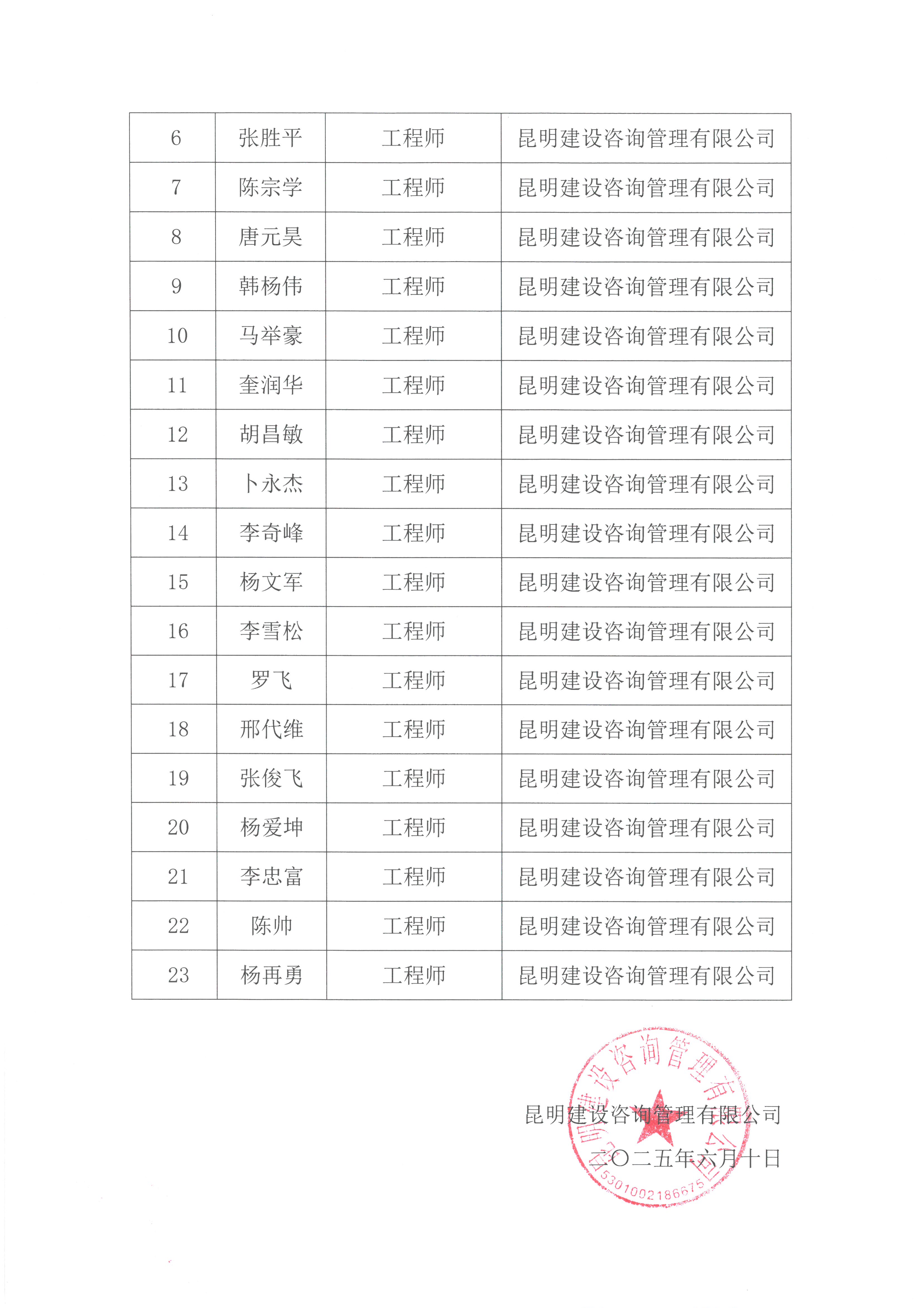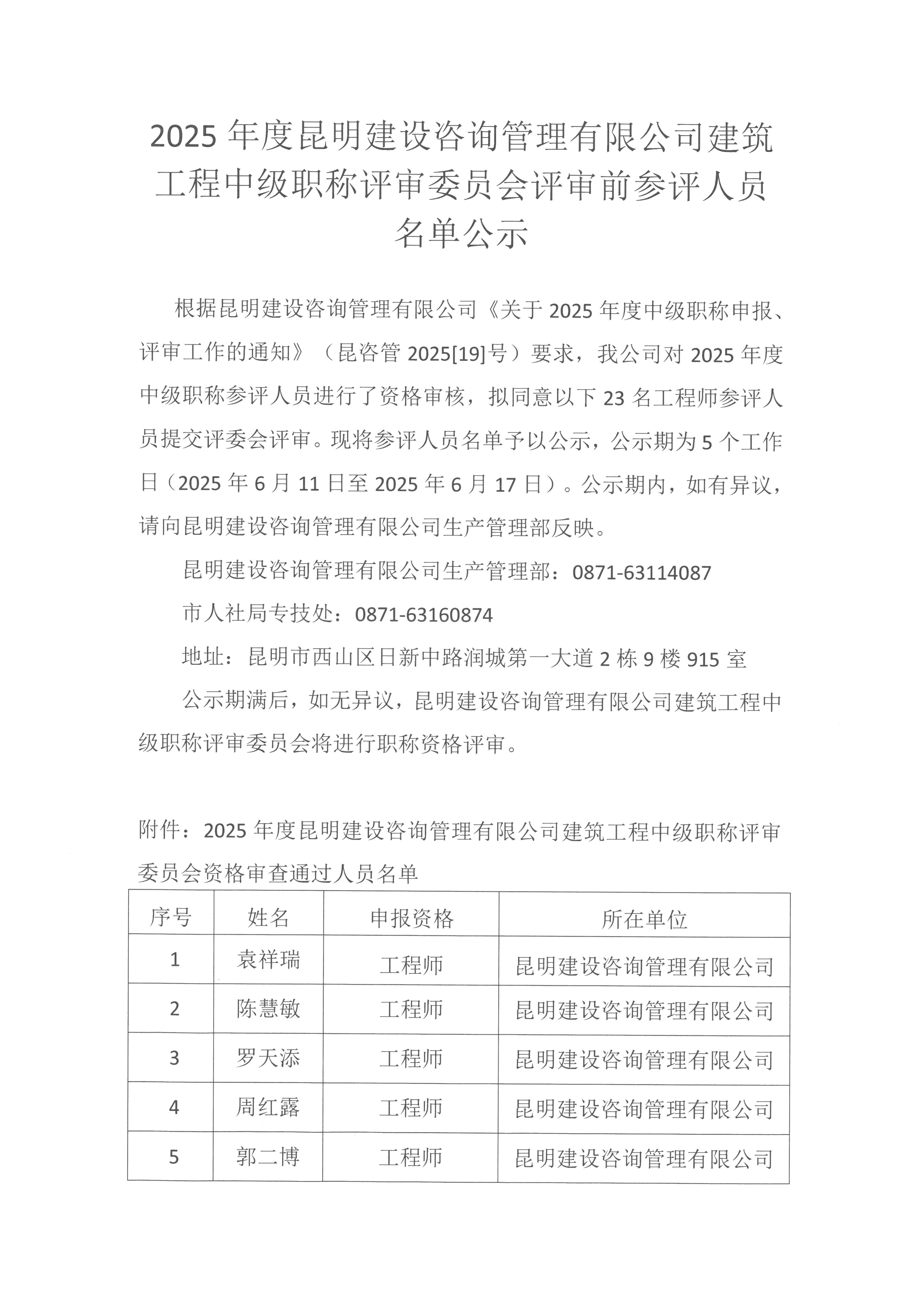 2025年度昆明建设咨询管理有限雷火(中国)建筑工程中级职称评审委员会评审前参评人员名单公示
