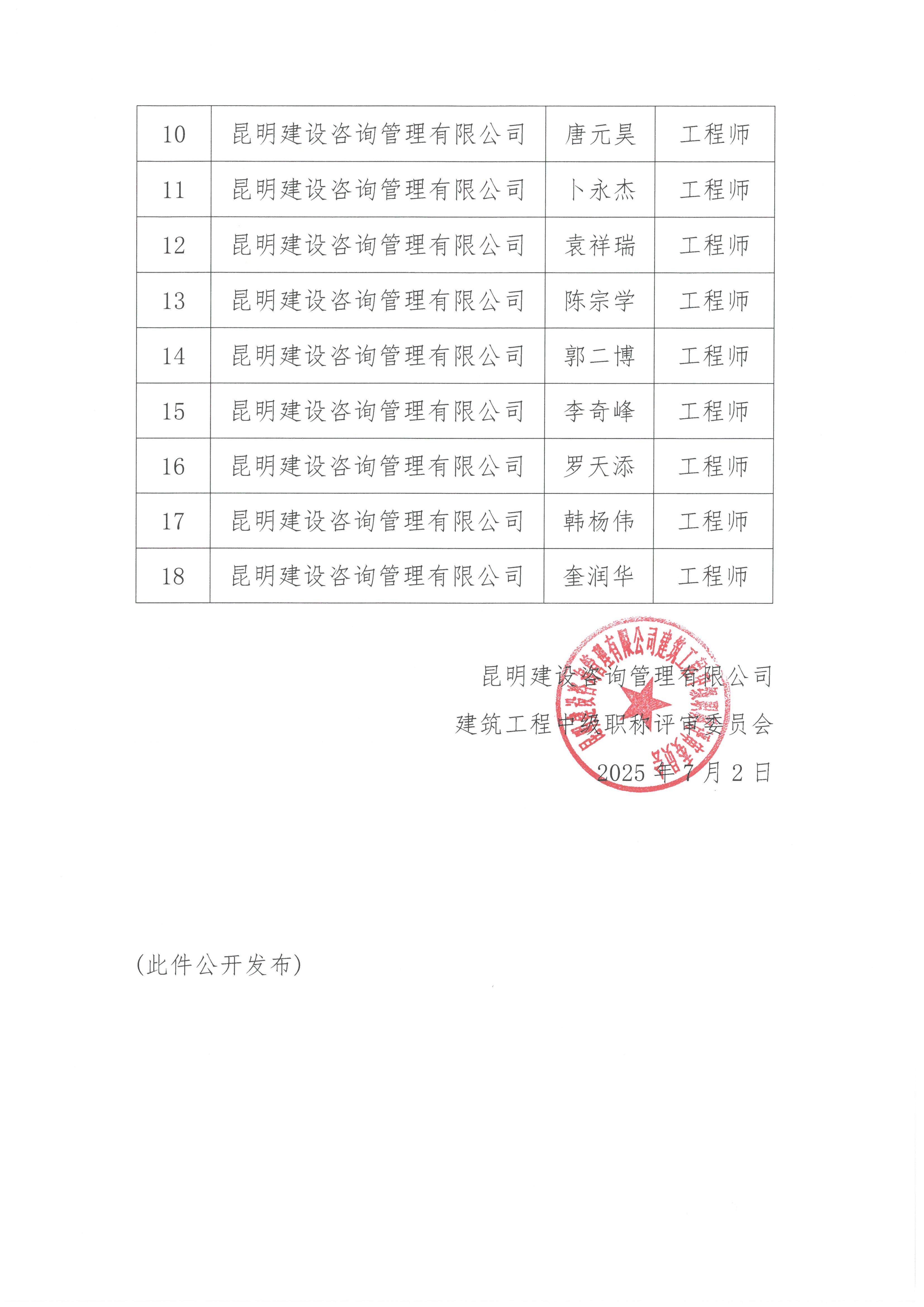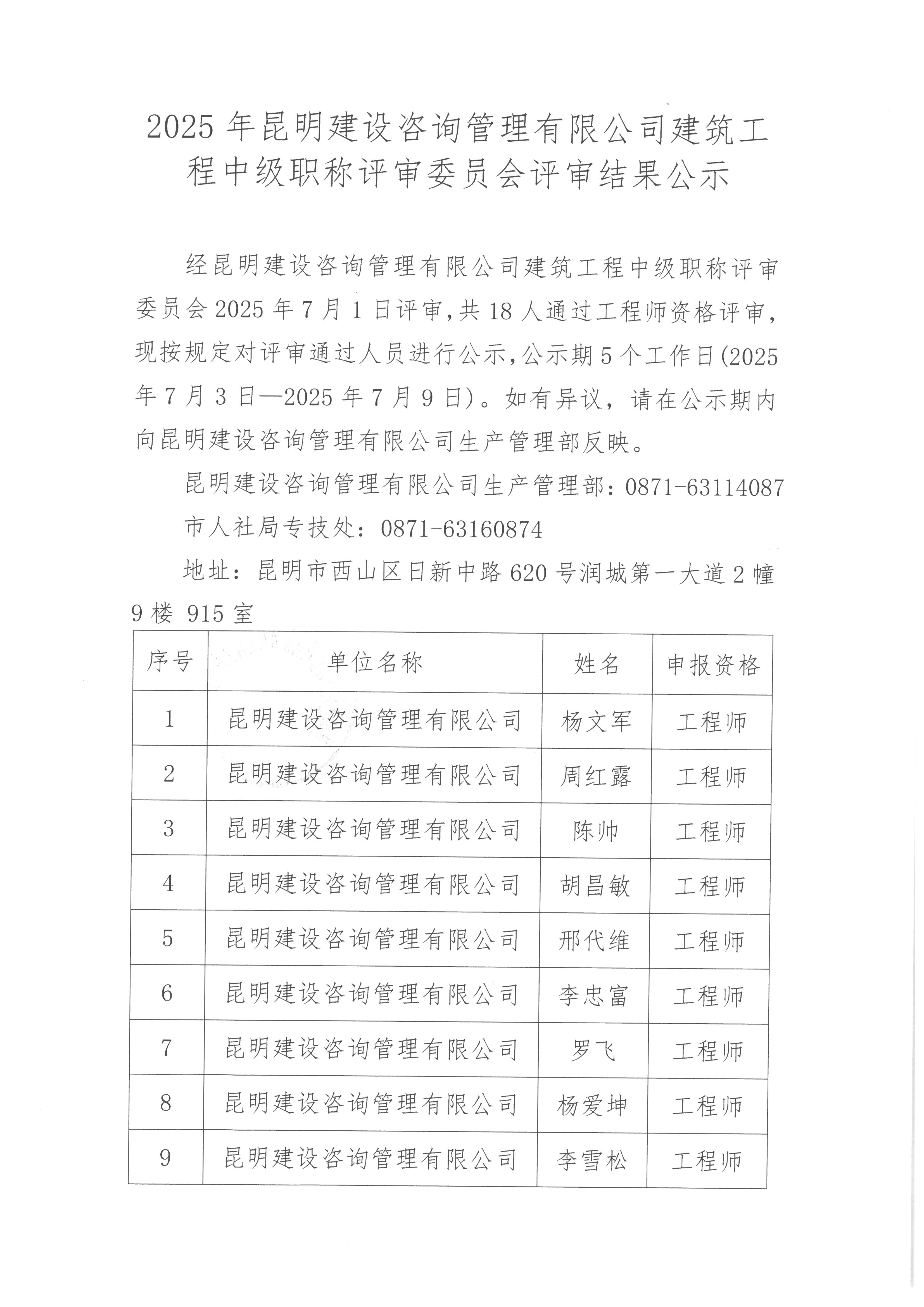 2025年昆明建设咨询管理有限雷火(中国)建筑工程中级职称评审委员会评审结果公示
